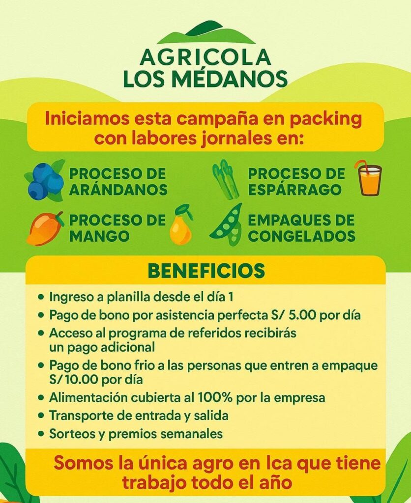 ¡Trabajo todo el año! Buscamos personal para Turno Día y Turno Tarde. Agrícola Los Médanos, la única agroindustria en Ica…
