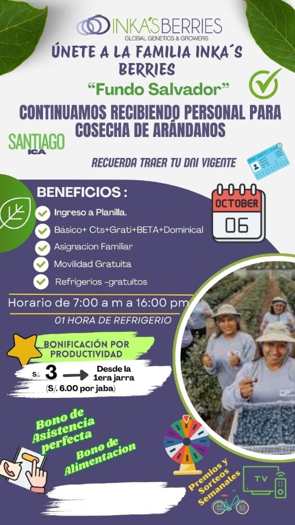 INKA'S BERRIES (Global Genetics & Growers) continúa buscando personal para la Cosecha de Arándanos en el Fundo Salvador, ubicado en…