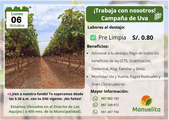 Manuelita te invita a unirte a su equipo para la Campaña de Uva. Estamos buscando personal para la labor de…
