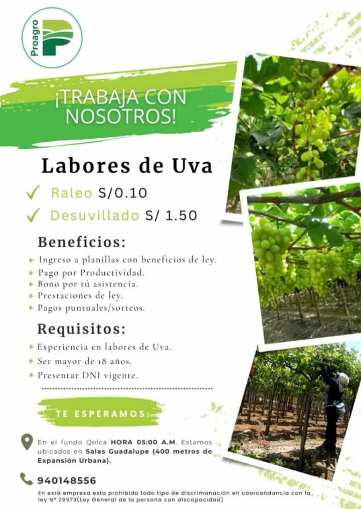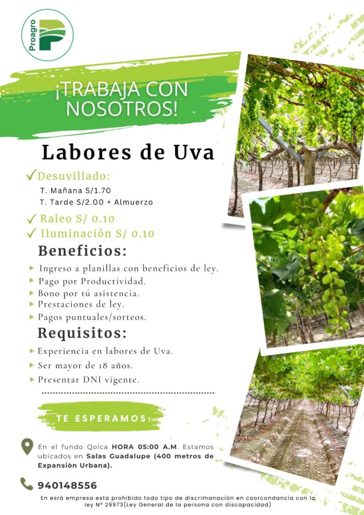 PROAGRO está buscando personal con experiencia para unirse a nuestro equipo en las labores de Uva. ¡Te ofrecemos excelentes beneficios…
