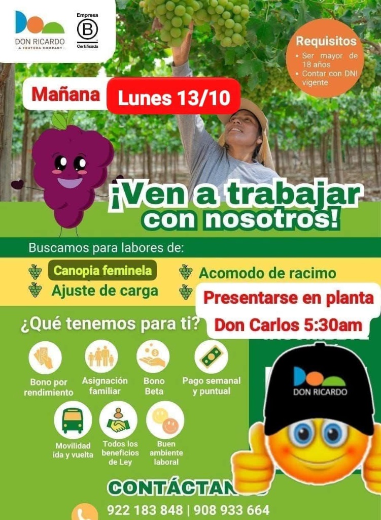 Empresa Don Ricardo te invita a unirte a su equipo para iniciar labores de campo en la campaña de uva. Si buscas estabilidad y excelentes beneficios, ¡esta es tu oportunidad!