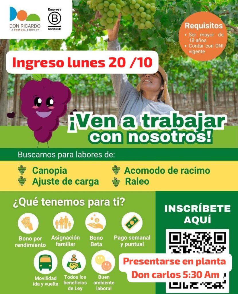 Don Ricardo está buscando personal para diversas labores en la vid con ingreso programado para el lunes 20/10.