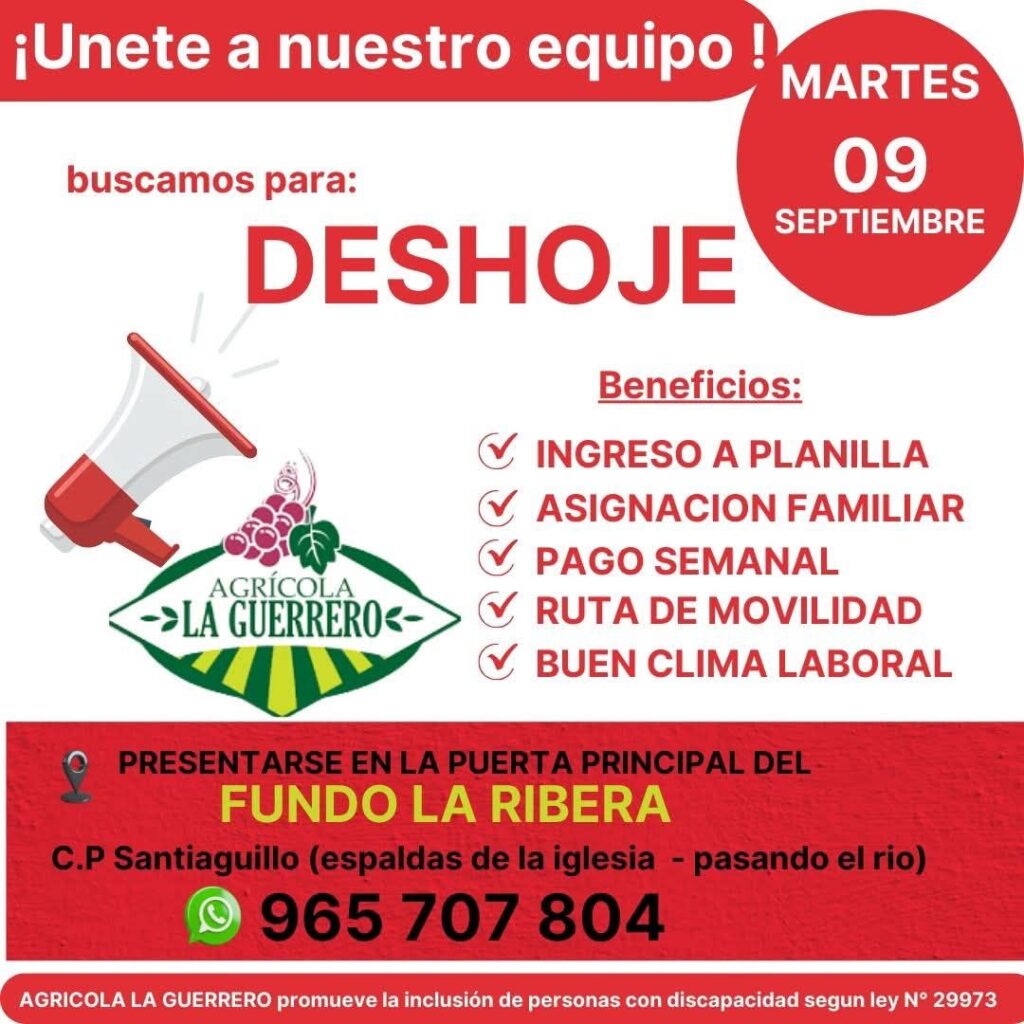 Estamos en búsqueda de personal para la labor de Deshoje. Si te interesa, te esperamos este martes 9 de septiembre.