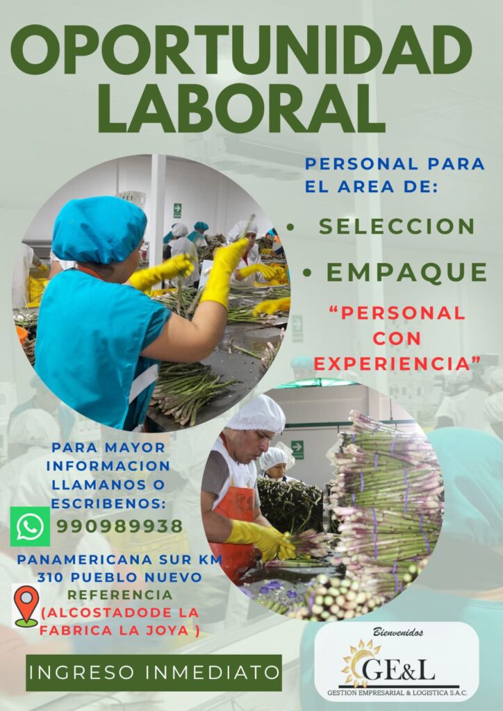 GE&L Gestión Empresarial & Logística S.A.C. en Ica te invita a formar parte de su equipo. Estamos buscando personal con experiencia en el área de packing para cubrir puestos de ingreso inmediato.