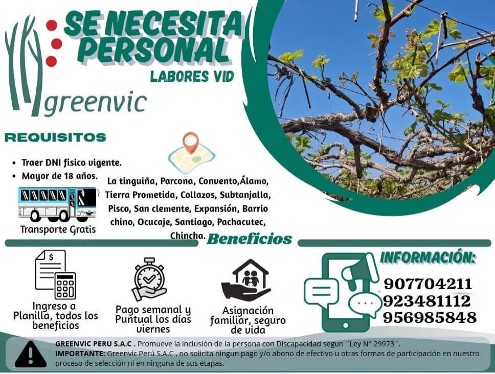 ¿Buscas un trabajo formal, con beneficios y estabilidad? Greenvic Perú S.A.C. está en la búsqueda de personal para labores de vid, ofreciendo un puesto de trabajo con excelentes condiciones y un compromiso real con la inclusión.