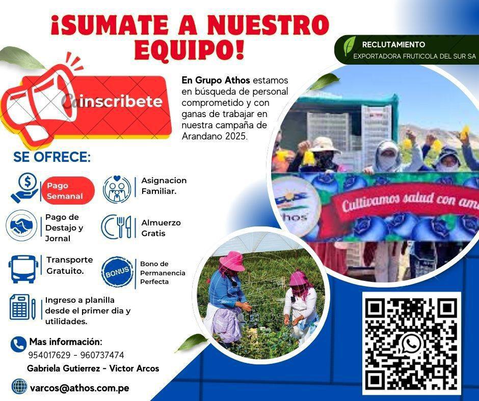 Grupo Athos (Exportadora Frutícola del Sur SA) está en búsqueda de personal comprometido y con ganas de trabajar en nuestra Cosecha de Arándano 2025.