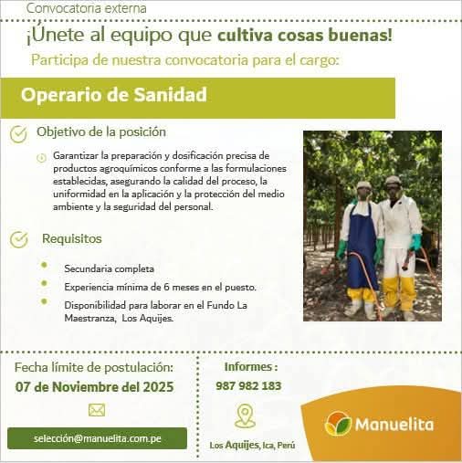 ​¿Te apasiona el sector agrícola y buscas una oportunidad estable en Ica? Manuelita, líder agroindustrial, te invita a participar en la convocatoria para el puesto de Operario de Sanidad en nuestro Fundo La Maestranza, ubicado en Los Aquijes.