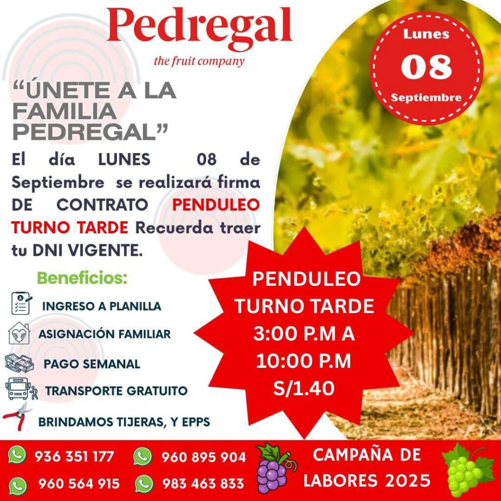 Si estás interesado en el puesto de Penduleo en turno tarde, te esperamos el lunes 8 de septiembre.