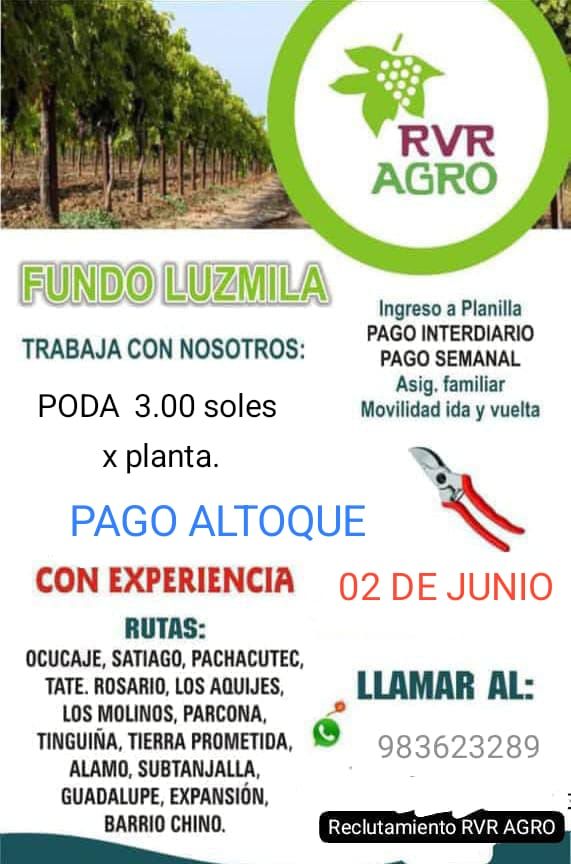 ¡Podador con experiencia, esta es tu oportunidad! RVR AGRO y Fundo Luzmila te esperan mañana Lunes 02 de Junio. ¡Cupos limitados por la alta tarifa, llama ahora!