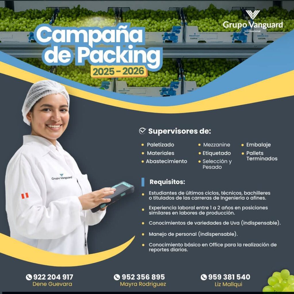 Grupo Vanguard te invita a formar parte de su nueva Campaña de Packing de Uva 2025 – 2026. Estamos en búsqueda de Supervisores(as) proactivos y experimentados para diversas áreas clave en nuestro proceso.
